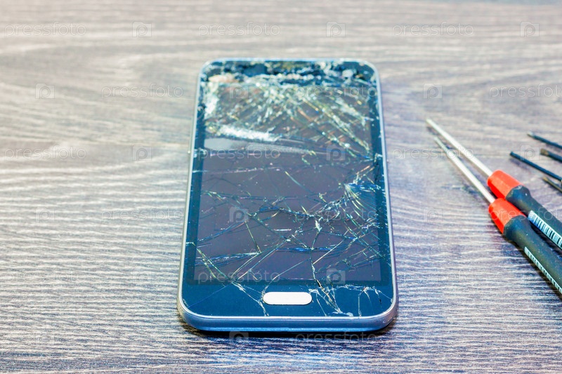 Сломанный сотовый телефон на столе с инструментами, готовыми к ремонту