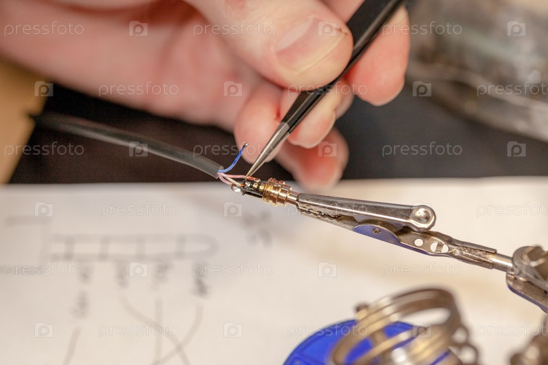 Электрик ремонтирует электрический компонент, на столе с устройством и инструментами, крупный план, размытый фон