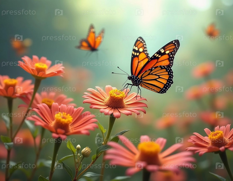 Нежная бабочка-монарх грациозно порхает над ярко-оранжевыми цветами, окруженная мягким размытым фоном, который вызывает ощущение безмятежной атмосферы сада. Генеративный ИИ