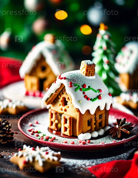 Очаровательный пряничный домик с заснеженной крышей стоит на тарелке, окруженный восхитительными угощениями и праздничными украшениями, передавая дух праздника. Новый год, рождественские украшения. Генеративный ИИ