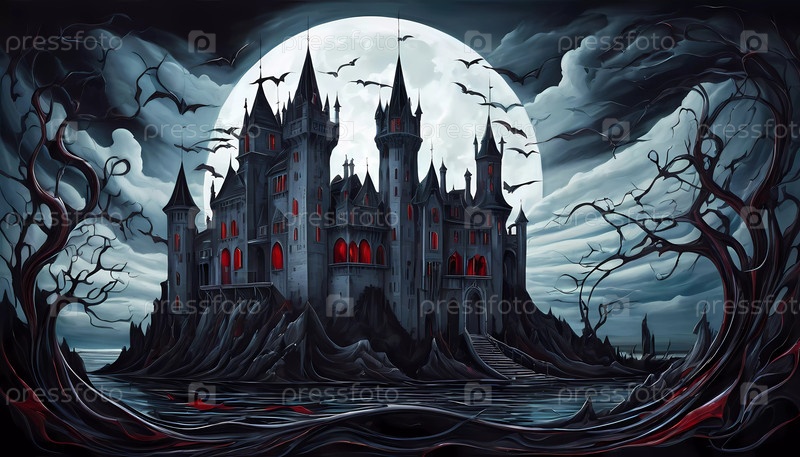 Темный замок с возвышающимися шпилями и светящимися красными окнами возвышается над скалистым ландшафтом. Летучие мыши разлетаются по небу под полной луной, создавая угрожающую атмосферу