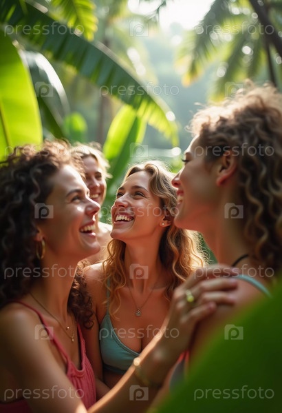 Друзья празднуют летние каникулы в пышной тропической обстановке с смехом и улыбками среди яркой зелени.Тропы это климатические зоны Земли, в которых Солнце находится в зените по крайней мере один раз в год