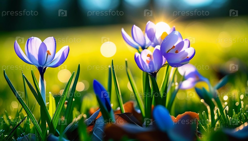 Нежные розовые цветы крокуса расцветают на сочной зеленой траве, солнечный свет в спокойной весенней обстановке. Возрождение природы. Шафранный крокус род многолетних луковичных травчатых растений семейства Ирисовых. AI