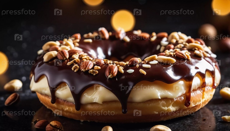 Соблазнительная витрина из пончиков, покрытых шоколадной глазурью и украшенных разнообразными орехами, выставлена на деревенском деревянном столе. Теплое освещение подчеркивает вкусные детали и текстуры угощений. Генеративный ИИ