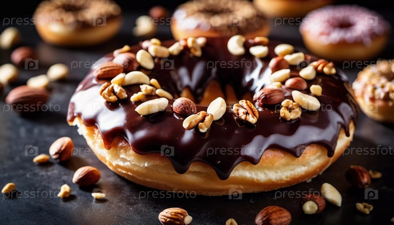 Соблазнительная витрина из пончиков, покрытых шоколадной глазурью и украшенных разнообразными орехами, выставлена на деревенском деревянном столе. Теплое освещение подчеркивает вкусные детали и текстуры угощений. Генеративный ИИ