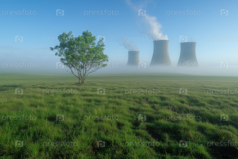 Атомная электростанция с дымящимися трубами туманным утром