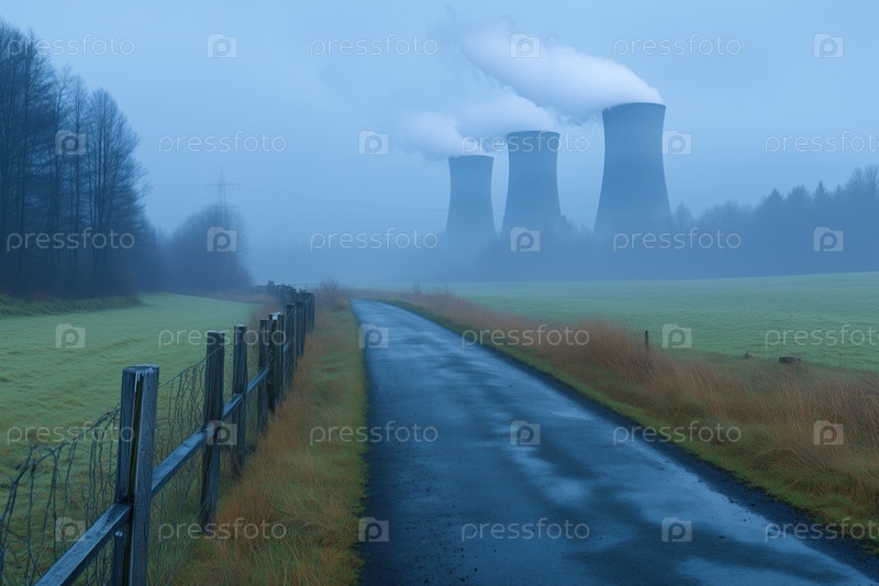 Атомная электростанция в туманное утро. Энергетическая промышленность