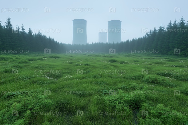 Атомная электростанция в туманном лесу