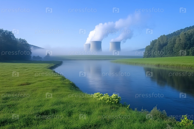 Атомная электростанция туманным утром,