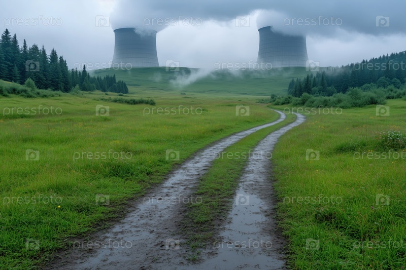 Грунтовая дорога в лесу и промышленные градирни вдалеке