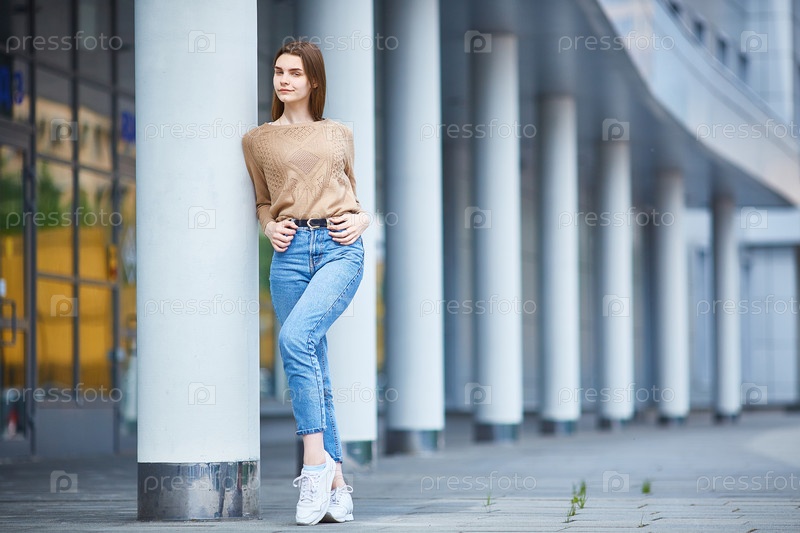 Девушка в полный рост модельной внешности демонстрирует повседневную одежду