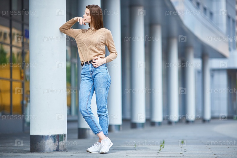 Девушка в полный рост модельной внешности демонстрирует повседневную одежду