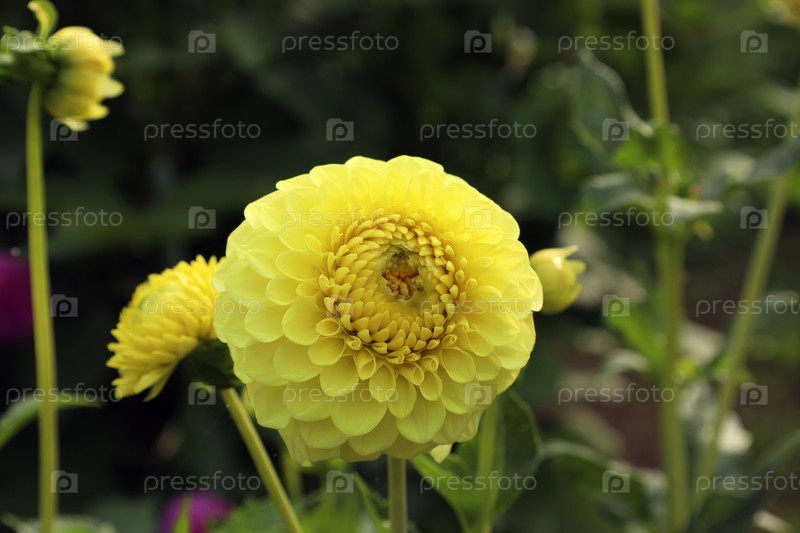 Желтый георгин помпонный цветет на кусте в летний день