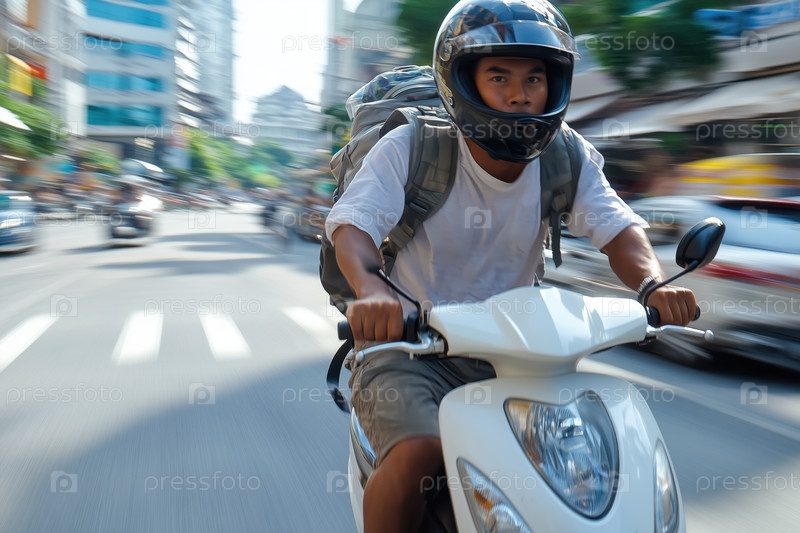 Мотоциклист в действии на дороге в азиатском городе
