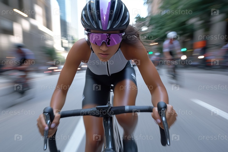 Женщина-велосипедист мчится по городской улице во время соревнований по велоспорту