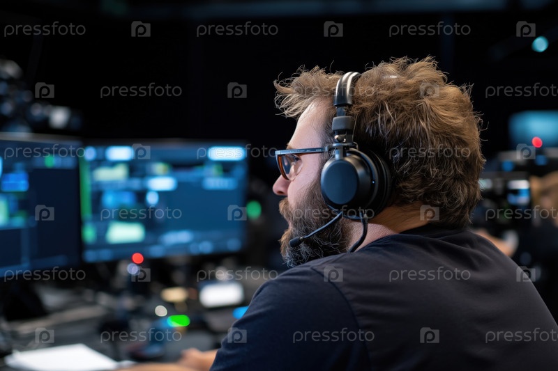 Вид сзади на человека в наушниках, работающего в темном зале перед мониторами