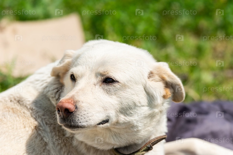 Деревенская сторожевая собака в ошейнике на улице