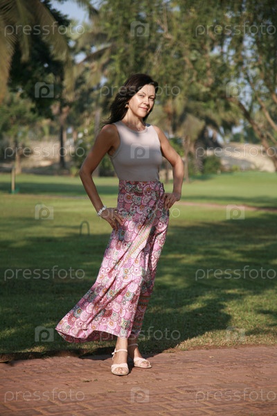 Красивая женщина возрастная модель 51 год позирует в юбке из шелка с традиционными узорами в Гоа Индия