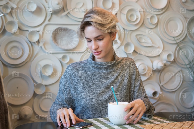 Молодая красивая женщина сидит в кафе и пьет кофе