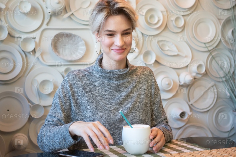 Молодая красивая женщина сидит в кафе и пьет кофе