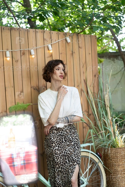 Молодая красивая женщина стоит возле велосипеда летом