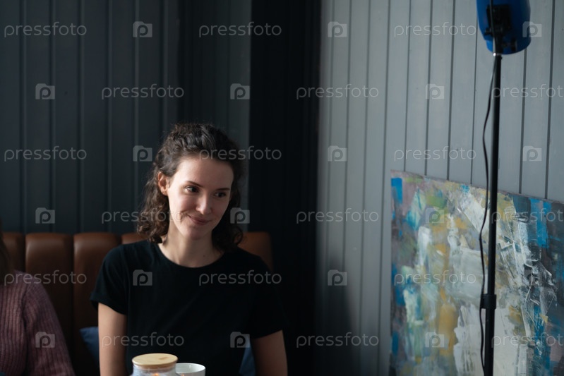 Молодая красивая женщина сидит в кафе и пьет кофе