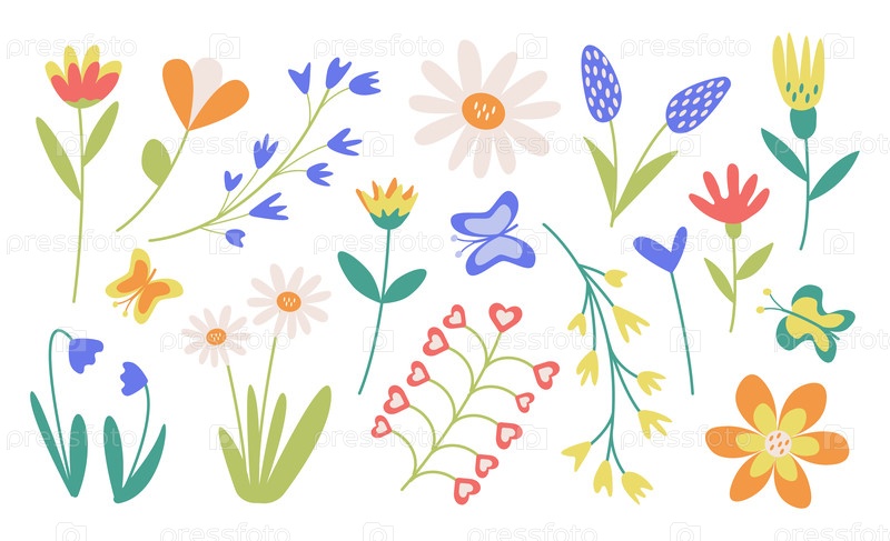 Векторная коллекция весенних цветов и бабочек. Набор праздничных цветочных композиций, клипарт. Нарисованные вручную иллюстрации цветов для украшения, дня матери, дня рождения, Пасхи, открыток