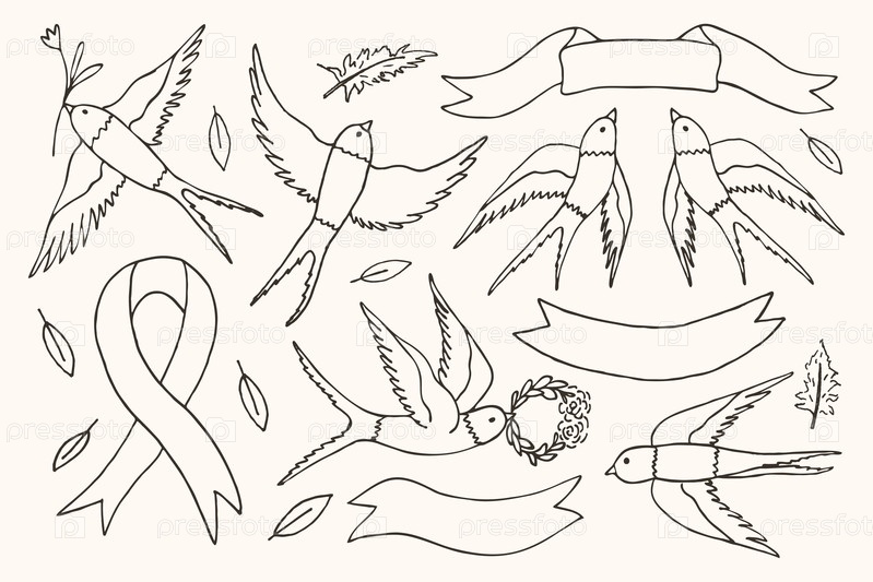 Набор векторных ласточек, первых весенних птиц и лент, баннера, символов. Рисованная иллюстрация