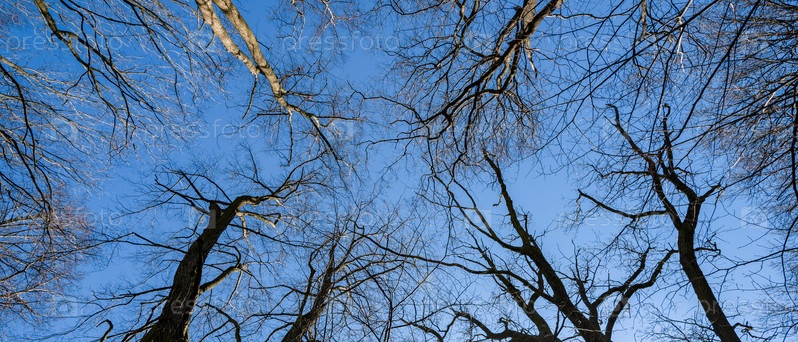Ветви старых дубов, вид снизу, на фоне голубого неба