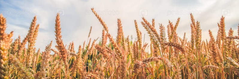 Спелые золотистые колосья пшеницы под голубым небом в солнечный день, крупный план
