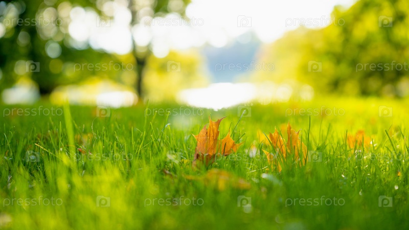 Опавшие желтые листья на траве под ярким осенним солнцем