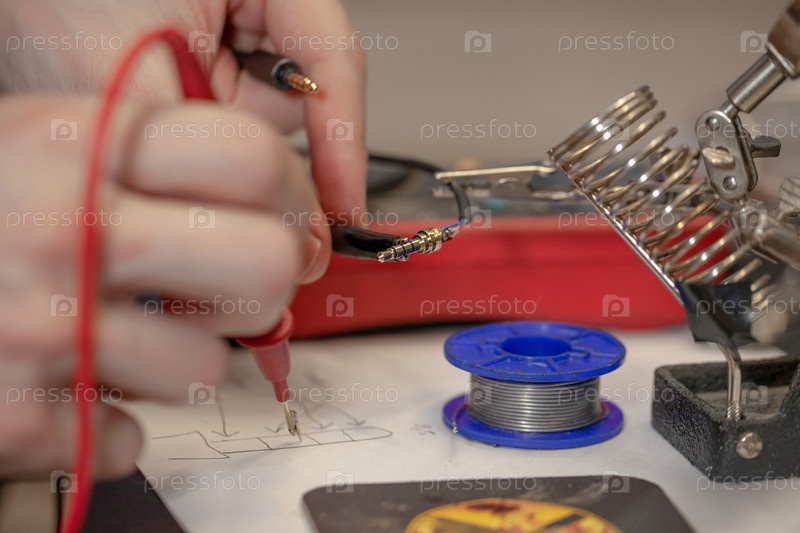 Электрик ремонтирует электрический компонент, на столе с устройством и инструментами, крупный план, размытый фон
