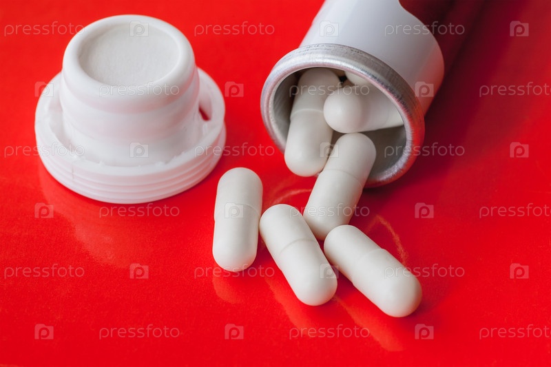 Белые капсулы высыпаются из контейнера, красный фон, крупный план