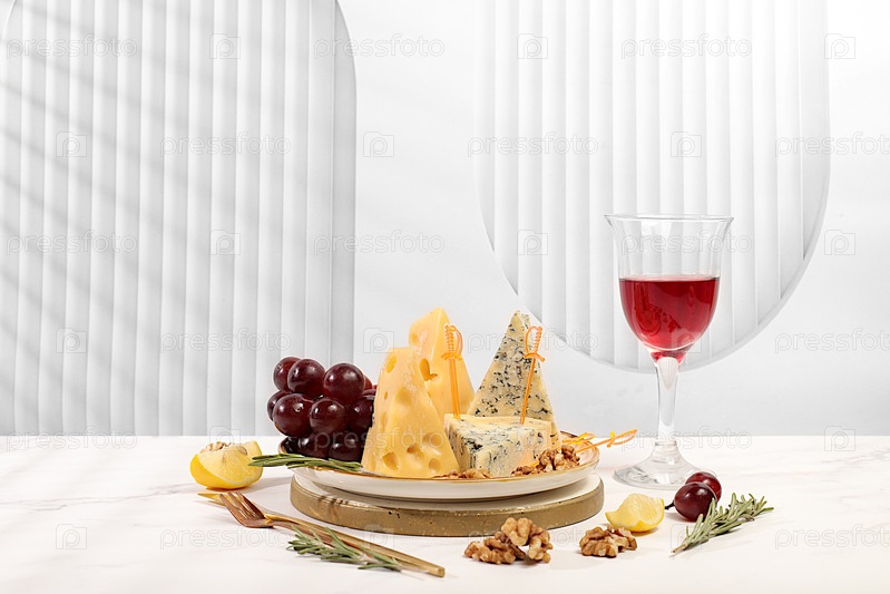 Натюрморт с гурманским голубым сыром, пармезаном, виноградом, медом, орехами, розмарином и вином. Дегустация вин. Сырная тарелка с сезонными закусками к вину, концепция итальянской кухни, меню для ресторана и кафе