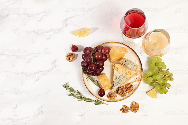 Вид сверху сырной тарелки с сезонными закусками к вину, натюрморт с изысканным голубым сыром, пармезаном, виноградом, орехами, розмарином и вином. Концепция итальянской кухни, меню для ресторана и кафе