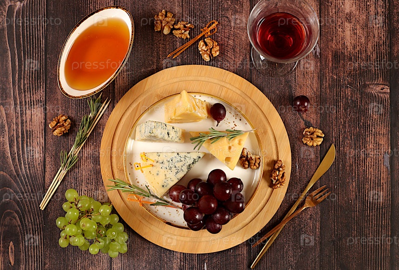 Натюрморт с изысканным голубым сыром, пармезаном, виноградом, медом, орехами, розмарином и вином. Вид сверху сырной тарелки с сезонными винными закусками, концепция итальянской кухни, меню ресторана и кафе