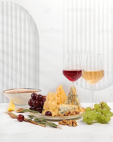 Натюрморт с гурманским голубым сыром, пармезаном, виноградом, медом, орехами, розмарином и вином. Дегустация вин. Сырная тарелка с сезонными закусками к вину, концепция итальянской кухни, меню для ресторана и кафе