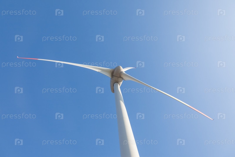 Ветряная турбина с солнечными бликами на фоне голубого неба, вид снизу