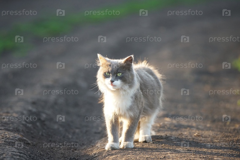 Серый кот на проселочной дороге