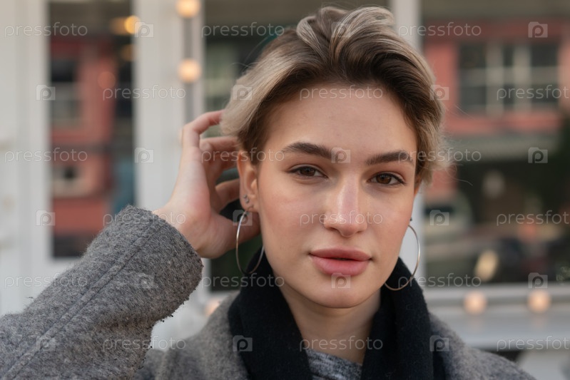 Портрет молодой красивой женщины в пальто на улице