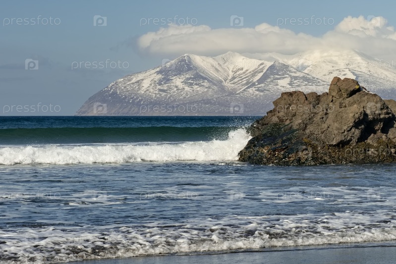 Россия. Дальний Восток. Курильские острова. Вид на базальтовые скальные выходы вулканического происхождения на морском песчаном берегу острова Итуруп