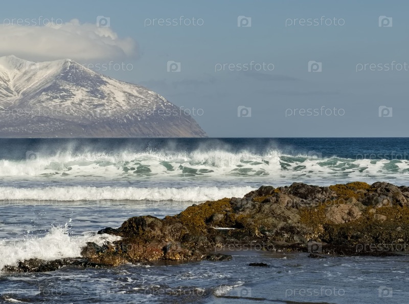 Россия. Дальний Восток. Курильские острова. Вид на базальтовые скальные выходы вулканического происхождения на морском песчаном берегу острова Итуруп