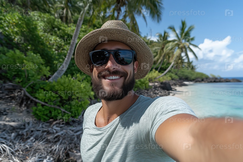 Молодой человек в шляпе и солнцезащитных очках делает селфи с мобильным телефоном на тропическом пляже