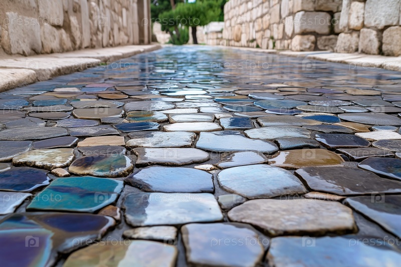 Каменная мостовая с каплями воды в старом городе