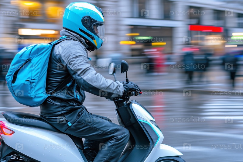 Мотоциклист едет на скутере в дождливый день по городу