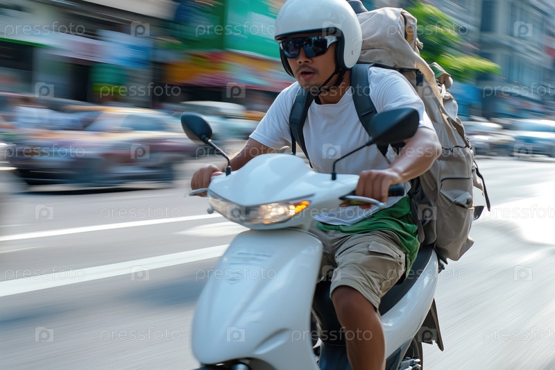 Мотоциклист едет на мотоцикле по городской улице