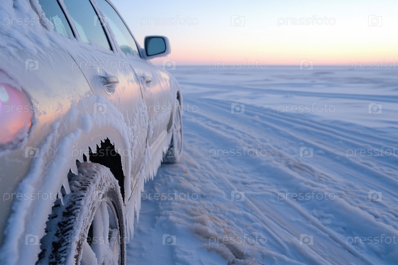 Автомобиль, покрытый льдом на зимней дороге на закате. Автомобиль, покрытый снегом