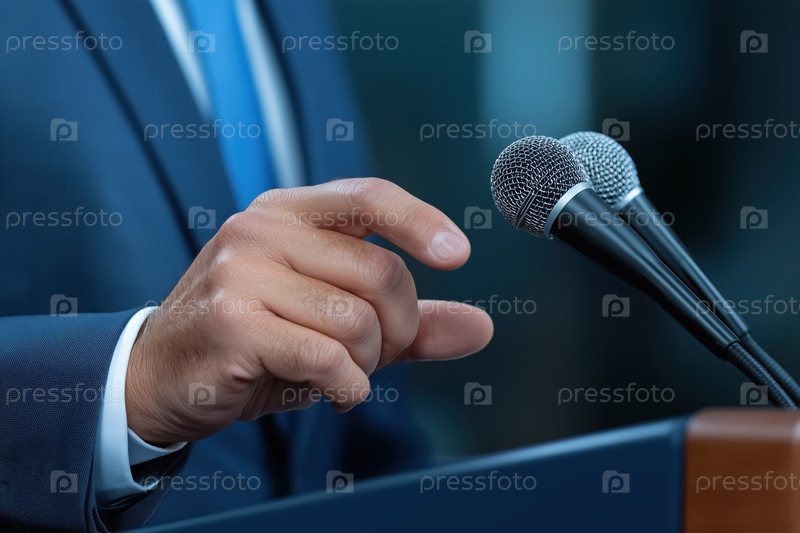 Крупный план руки оратора, жестикулирующей перед микрофоном