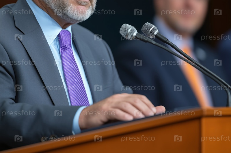 Крупный план высокопоставленного бизнесмена или политика, выступающего с речью в конференц-зале