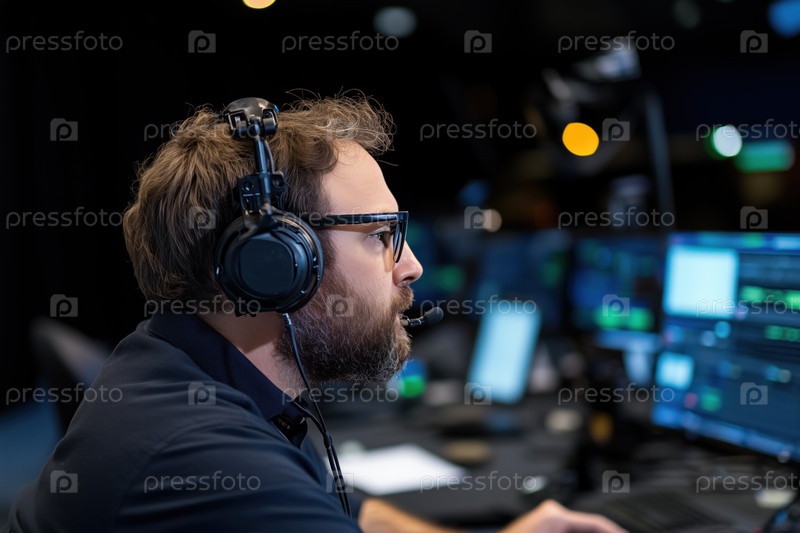Мужчина с бородой в наушниках работает в темной студии перед оборудованием с мониторами